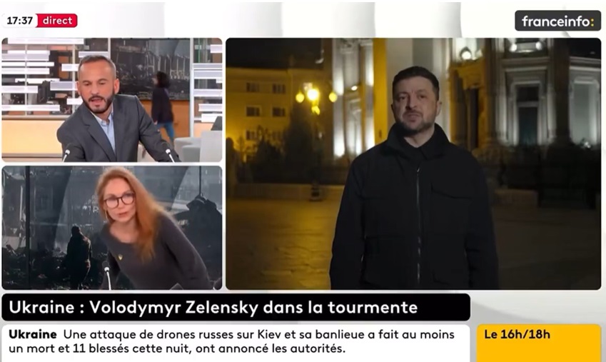La scène a été immortalisée par le direct  sur la chaîne France Info, la chaîne d’info continue du groupe France télévision, où le journaliste était en direct en train de commenter la chute politique du président Ukrainien Zelinsky