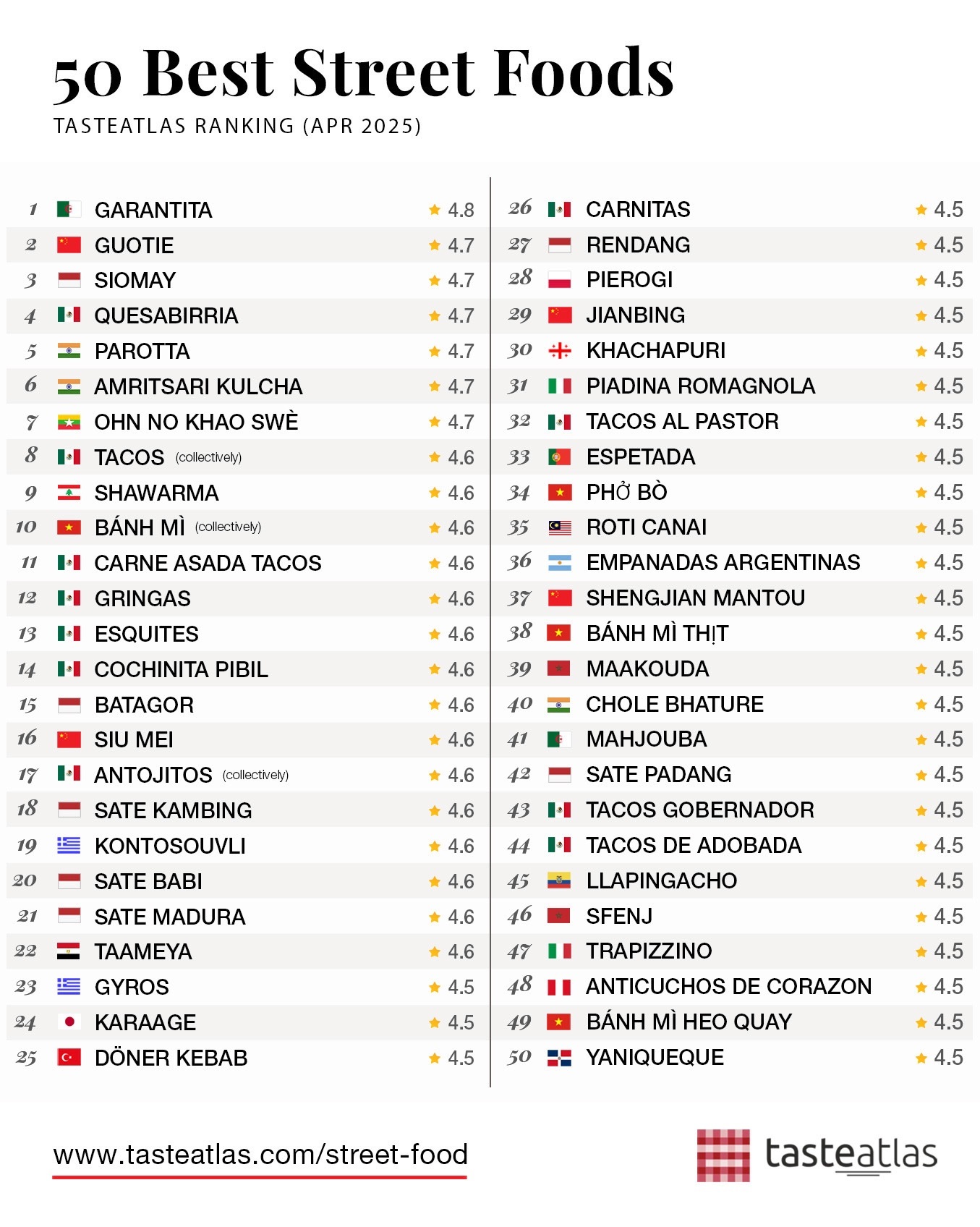 Sur les dix premières places, d’autres mets de rue à travers le monde, ont également été retenus derrière celui de la Garantita, parmi lesquels, « le Guotie » (Chine), le Siomay (Indonésie), la Birria Tacos ou Tacobirria (Mexique) et le Parotta (Inde).