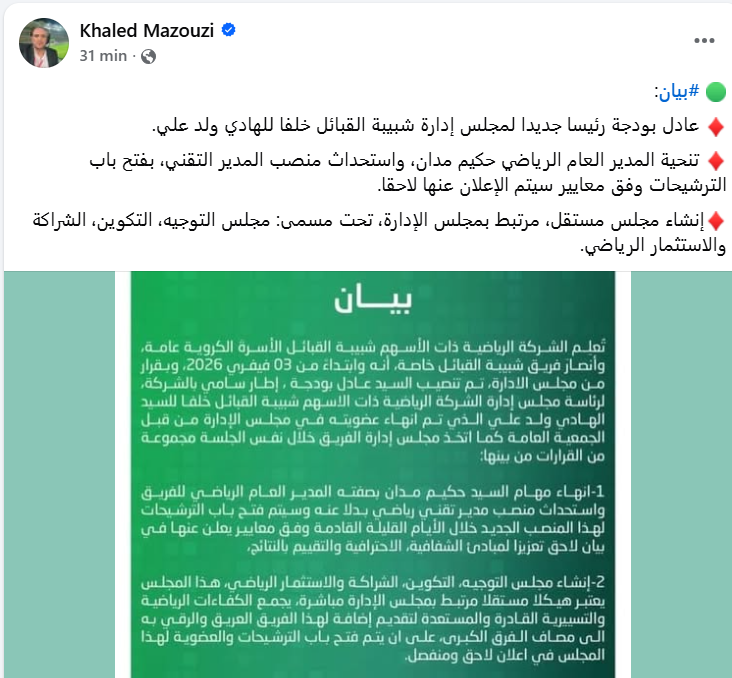 Mettre fin aux fonctions de M. Hakim Meddane en tant que directeur général sportif de l’équipe, et créer le poste de directeur technique sportif qui lui succédera. Les candidatures pour ce nouveau poste seront ouvertes dans les prochains jours, selon des critères qui seront annoncés dans un communiqué ultérieur, dans le respect des principes de transparence, de professionnalisme et d’évaluation équilibrée.