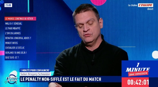 DIA-10 Janvier 2026: La CAN continu d’avoir son lot de magouilles et manigances du Maroc pour s’approprier la CAN 2025. En plus de changer les arbitres à la dernière minute, le Maroc élimine la VAR pour éliminer toutes les chances des adversaires du Maroc . Ainsi Gregory Schneider journaliste du quotidien L’Equipe a finalement exprimé sa déception de l’arbitrage des matchs du Maroc et il le fait savoir ouvertement sur le plateau de l’Equipe Tv : « Ce qui serait bien c’est qu’on gagne un peu de temps et qu’on leur donne leur coupe directement. Il faut qu’on arrête de me prendre pour une bille moi en tant que spectateur et qu’on arrête d’insulter le foot et les joueurs qui sont les premières victimes ! », a lâché Schneider sur un ton de colère.
