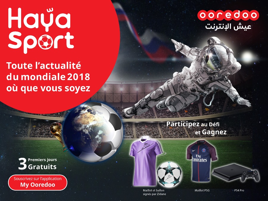 DIA-27 juin 2018: Ooredoo accompagne ses clients durant la Coupe du Monde 2018 et leur propose son service innovant « Haya! Sport » qui leur permet d’avoir, en direct, toute l’actualité du Mondial russe sur leur téléphone, ordinateur et via l’application « My Ooredoo ».